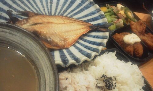 ~アジ開き&シジミ汁&お弁当屋さんのお弁当(白米と十六穀米のハーフ&ハーフ)&カツオめかぶ納豆~ *基本的にはいつも二人分ですっ。